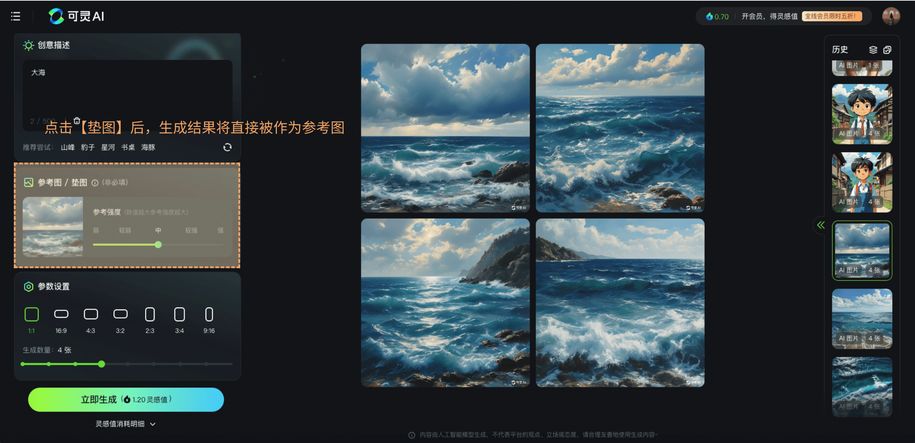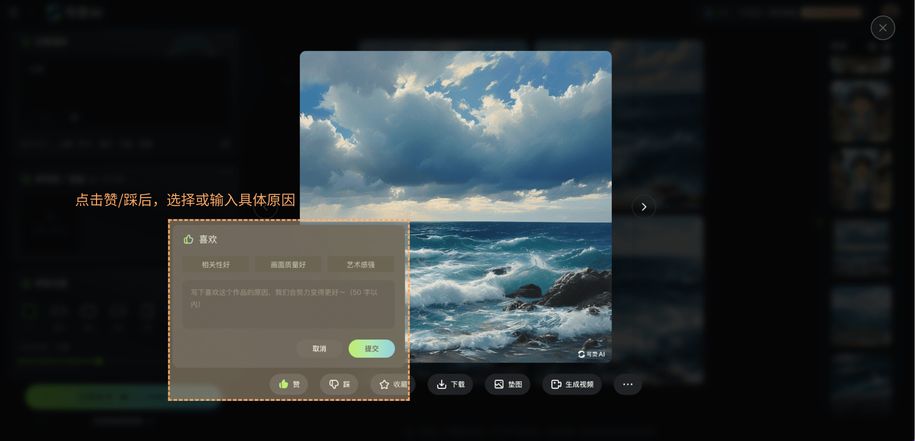 After clicking 【Like/Dislike】, you can continue to select or input the specific reasons why you like or dislike this image. Your feedback will help us to improve. | After clicking 【Reference/Base Image】, your generated result will be directly used as a reference image. | After clicking 【Generate Video】, you will be redirected to the 【Image-to-Video】 module of the 【AI Video】 function. Your image generation result will be used as input to generate a video. Please refer to the AI Video tutorial for detailed steps. |