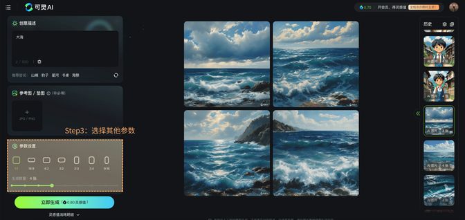 You can enter any text in the 【Creative Description】 module. The platform currently supports Chinese/English input, but please note that the word limit is 500 characters or less. When you’re temporarily lacking inspiration, you can use the prompts we’ve prepared in the 【Recommend trying】 section to generate images. | Additionally, during the process of generating images from text, you can use the【Reference/Base Image】 function by uploading a 【Reference/Base Image】. Just click the upload button, and you can select an image from your local files or from the platform's history of generated results. Please note that the platform currently does not support files other than JPG and PNG formats, and the file size should not exceed 10MB, with dimensions no smaller than 300px. | In the 【Parameter Settings】 module, you can flexibly set the size and number of images to generate. The platform currently supports generating 7 image sizes, and you can generate up to 9 images at once. | Finally, just click 【Generate】 to generate your image results! |