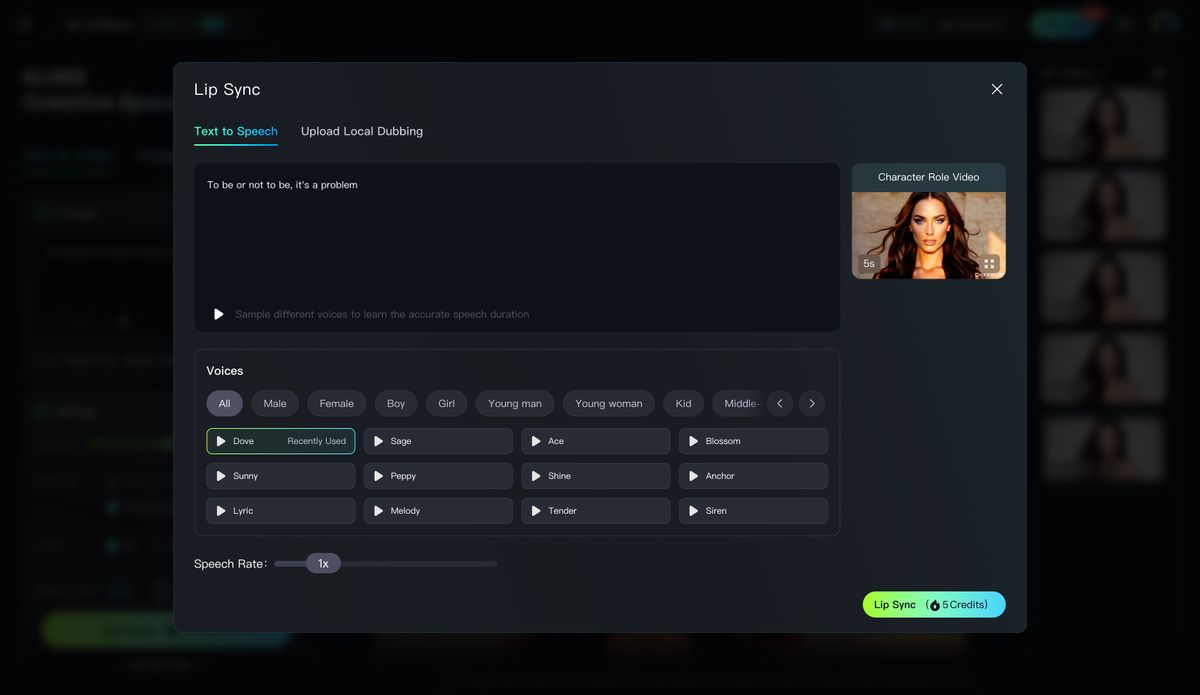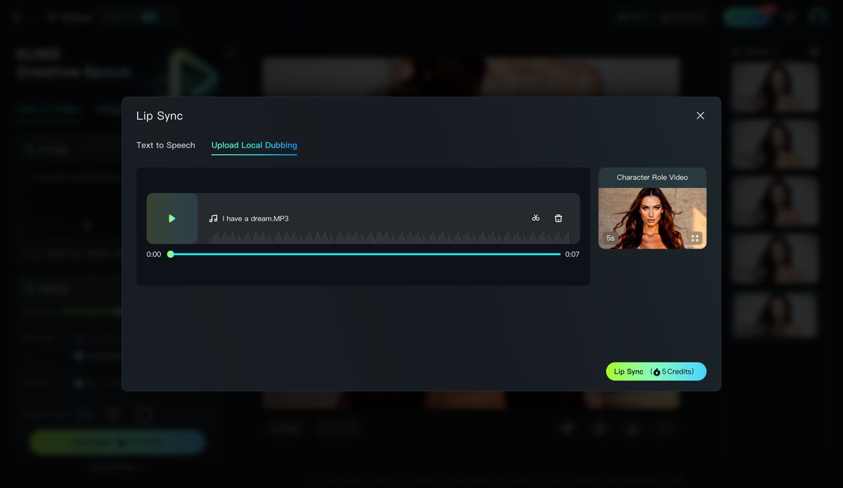 The "Lip Sync" feature allows you to upload local voiceover/singing files, or generate one through "Text to Speech" for the character videos generated in Kling AI. It synchronizes your characters’ lip movements perfectly with the audio, making them appear as if they're really speaking or singing, making your video even more lively!