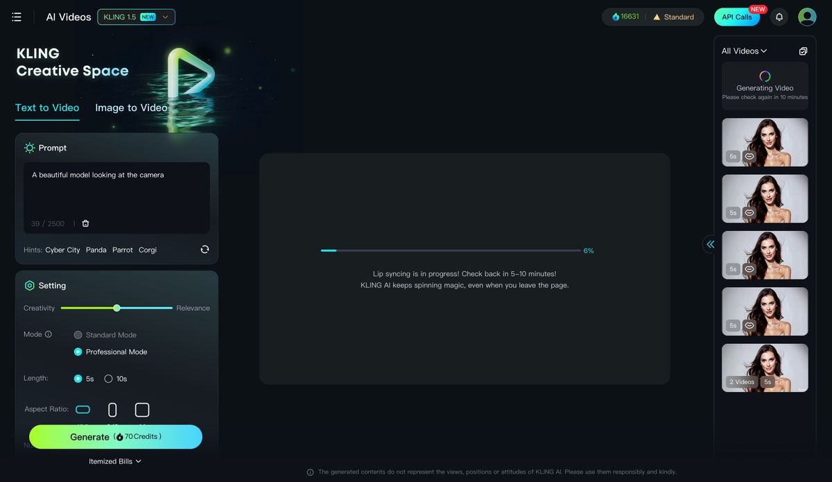 - Lip Sync is available for the videos generated in Kling 1.0 and Kling 1.5, provided the character's face is complete.
