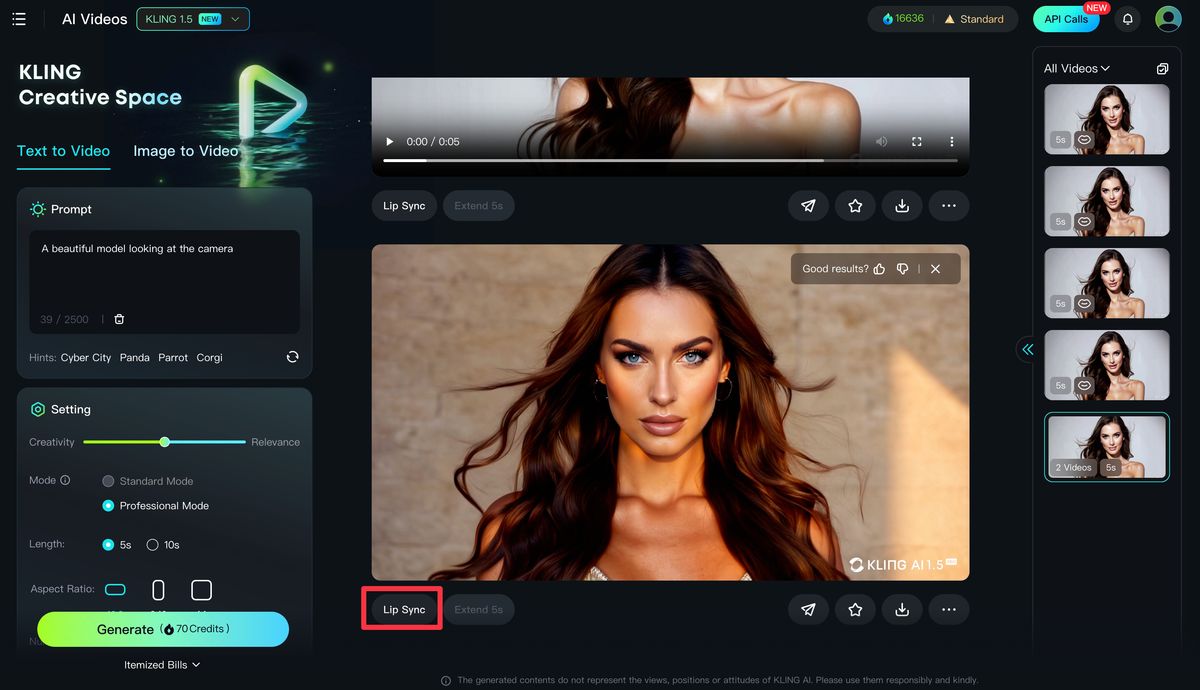 1) Generate a video featuring a character that has a complete face in Kling AI. Then click on "Lip Sync" and preview the effect.