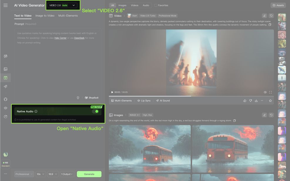 With the VIDEO 2.6 Model, we are introducing the "Native Audio" feature for the first time: a single generation that simultaneously produces video visuals and complete audio, including voiceovers, sound effects, and ambient sounds. This feature achieves seamless coordination in rhythm, emotion, and narrative expression, delivering a true "see what you hear" audio-visual experience.