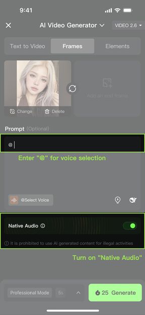 - This model supports both web and app platforms, allowing easy video generation on both devices. The final video output is determined by the prompt, input image (image-to-audio-visual), and parameter settings: