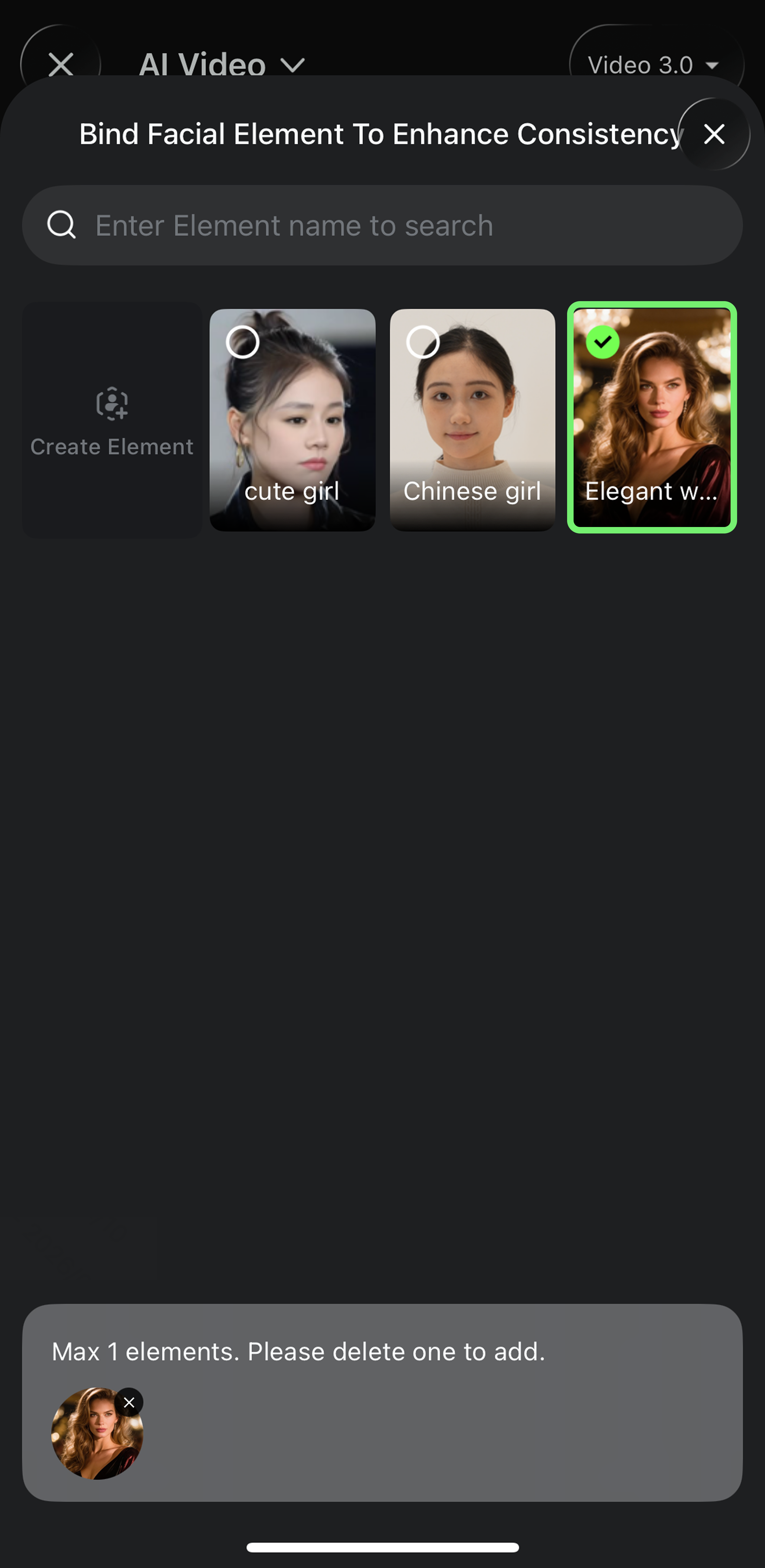 - If the element's face differs significantly from the face in the first frame, there is a small chance that facial quality may degrade, for example, when using a cat's face to reference a human.