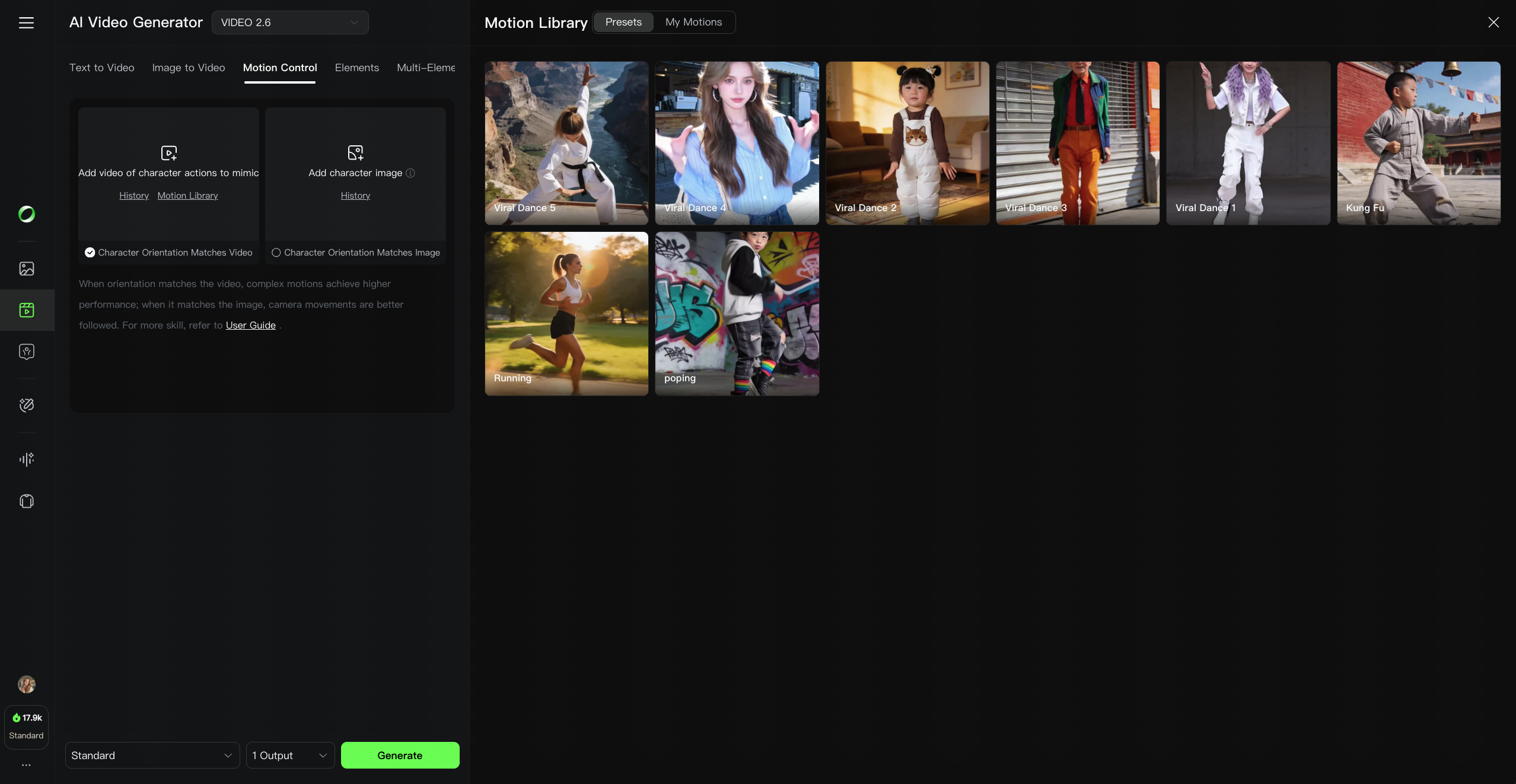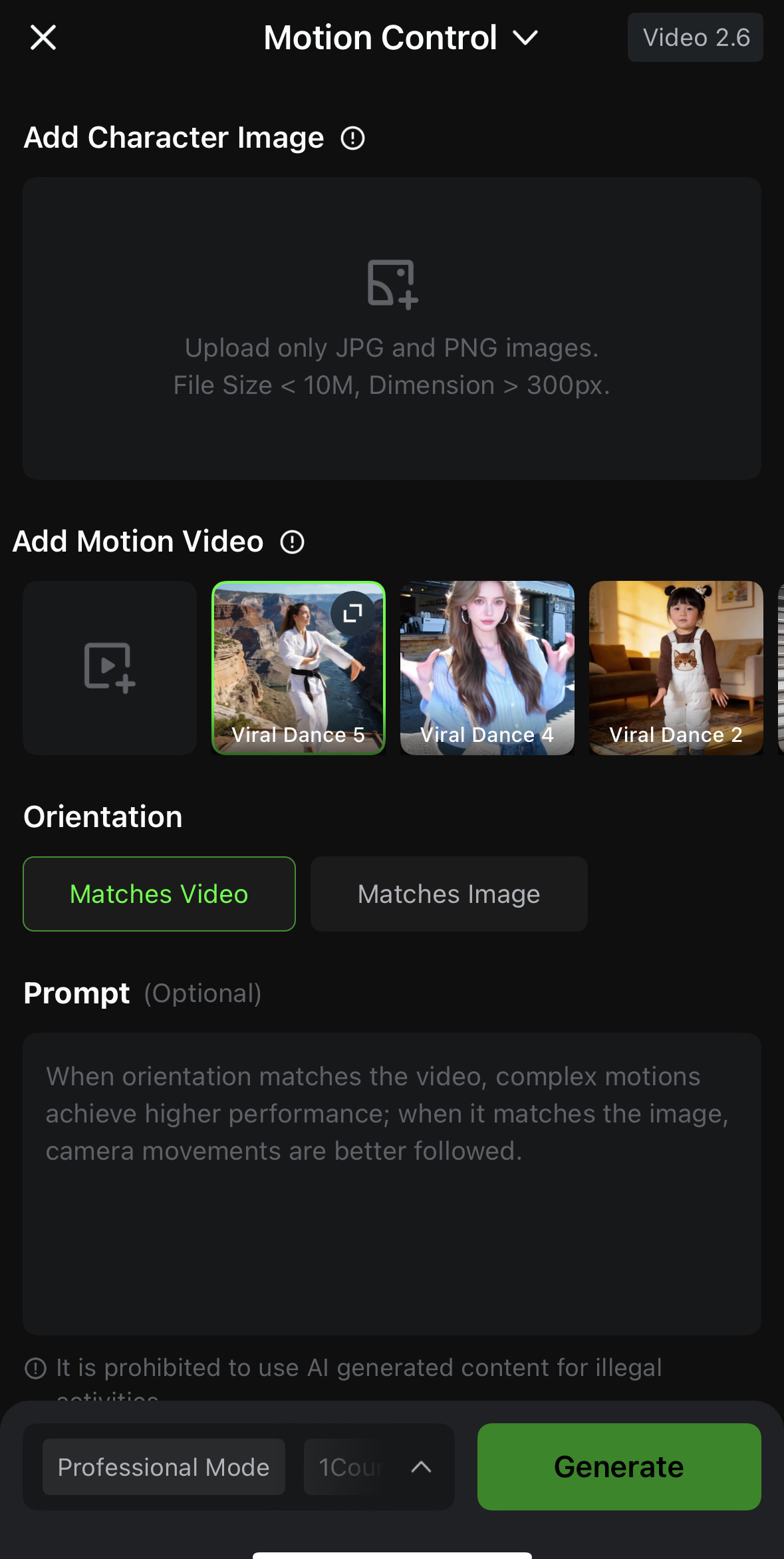 - Upload a single character motion reference. For motion reference with two or more characters, the motion of the character occupying the largest portion of the frame will be used for generation.