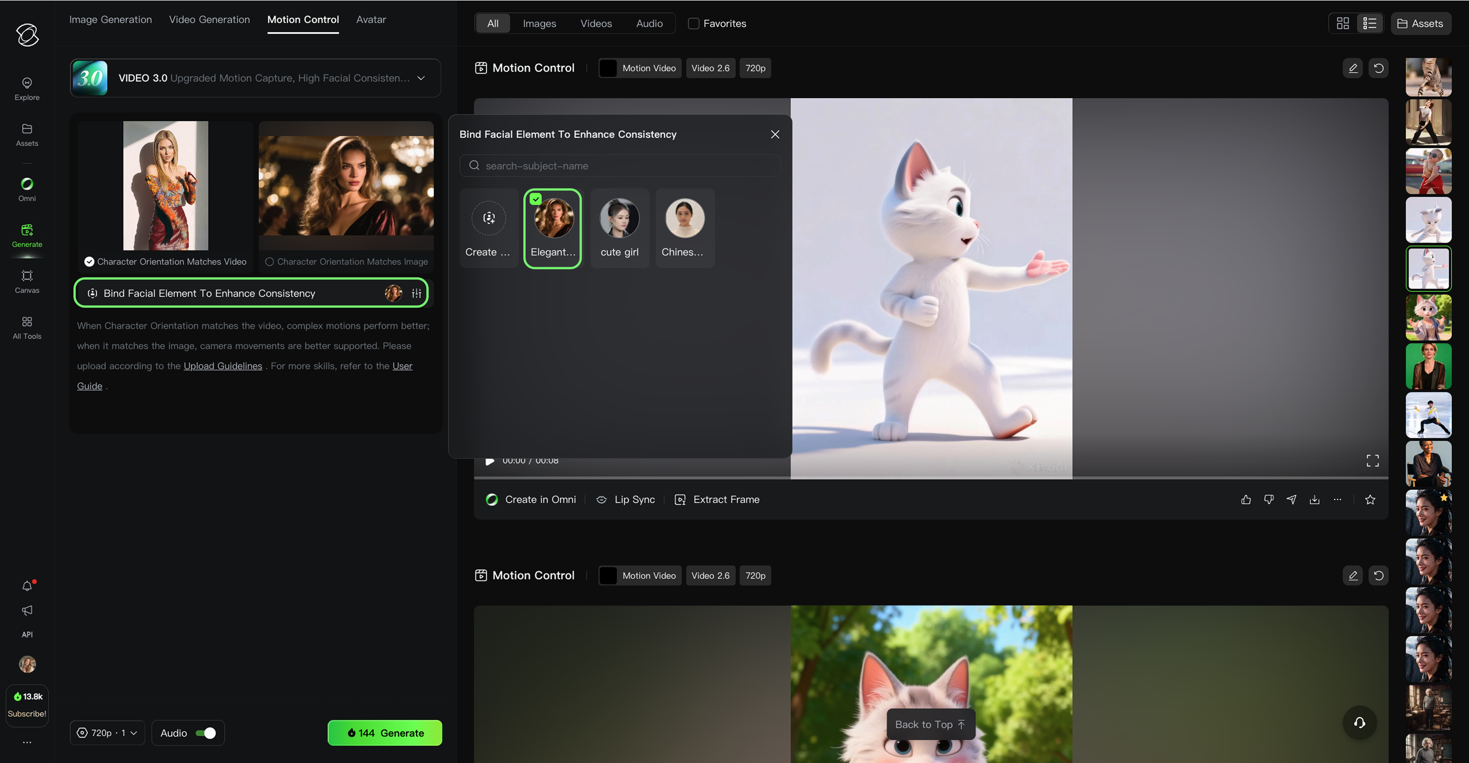 - The Motion Control Element Library only uses facial information for reference. It does not include clothing, hairstyle, makeup, or props. Therefore, we recommend uploading clear facial close-ups to ensure sufficient facial data.